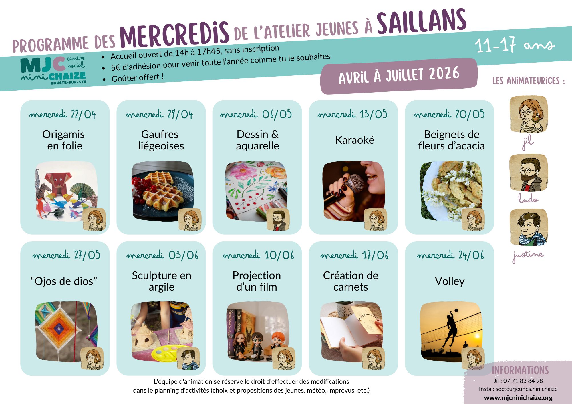 Les horaires peuvent être modifiés suivant le programme d’animation. La MJC-Centre Social Nini Chaize se réserve le droit de changer le programme en fonction de la météo ou de tout autre événement imprévu.